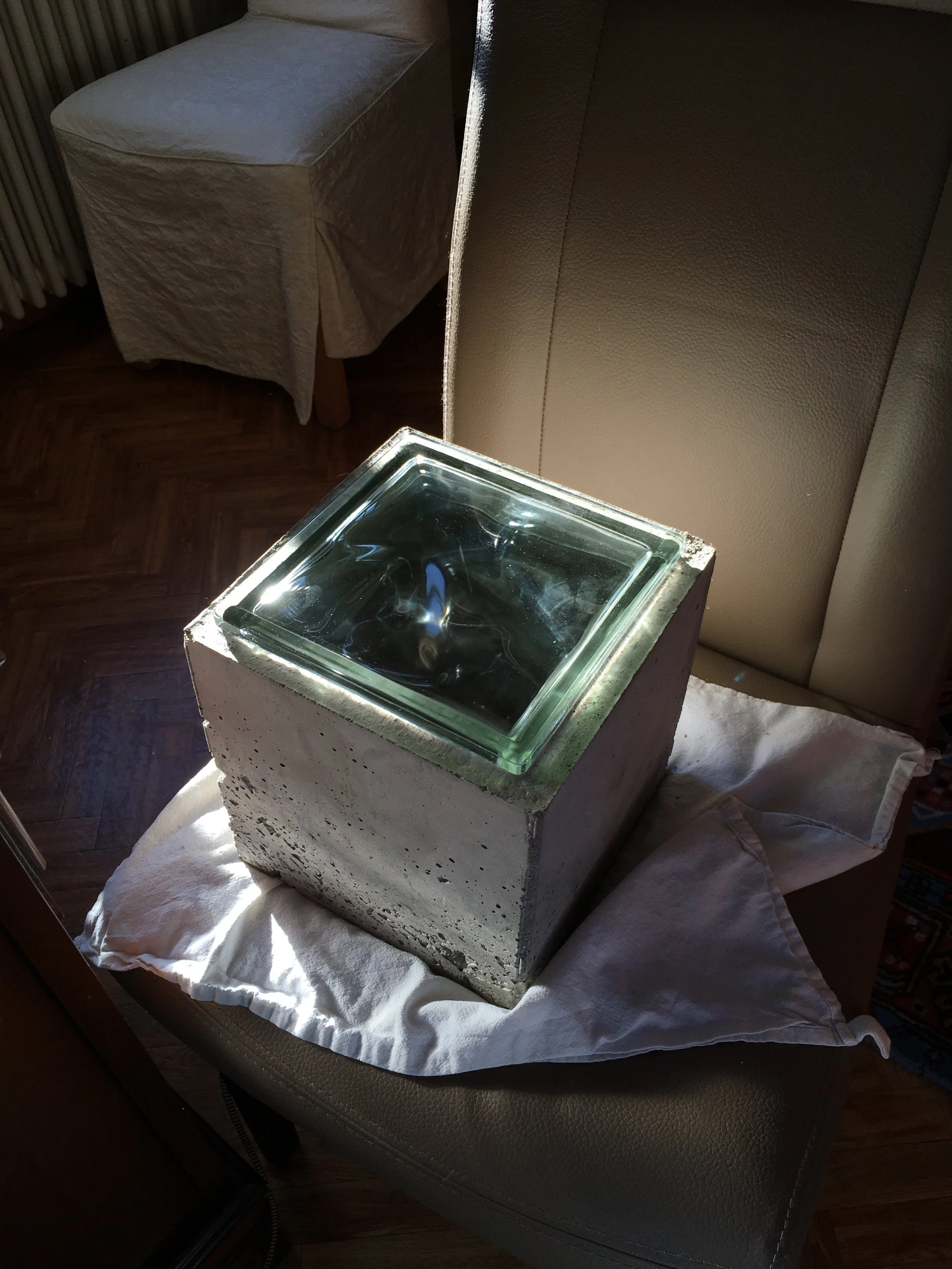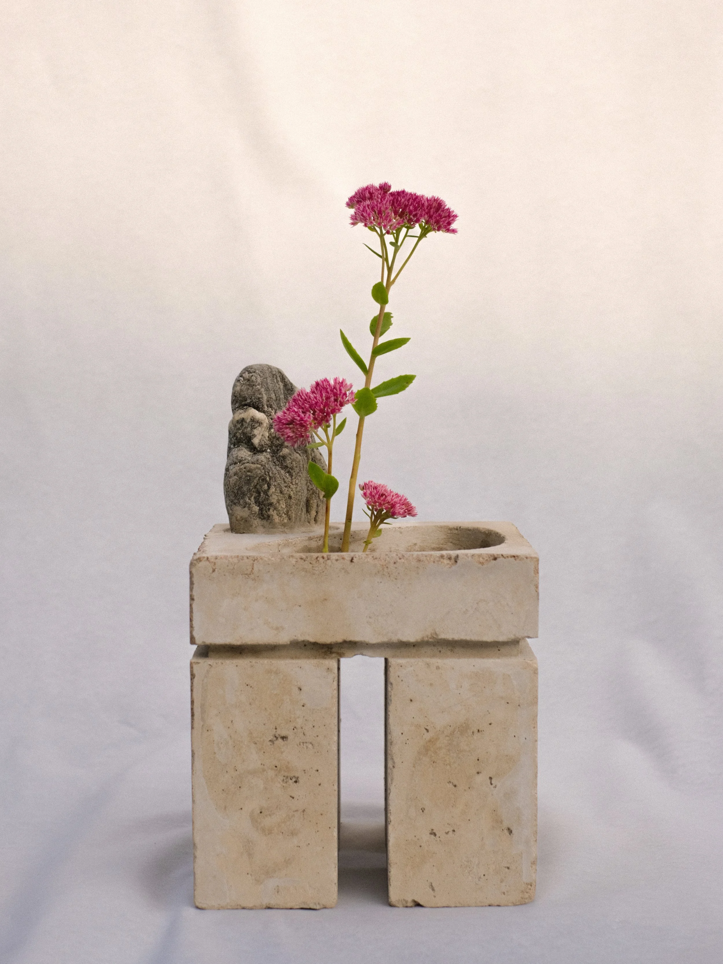 Concrete and stone Ikebana vase inspired by Brutalism and Japanese spirituality. The piece’s goal was to combine large, imposing, geometric elements with organic shapes and materials. Incorporates stones collected from French Mediterranean beaches
