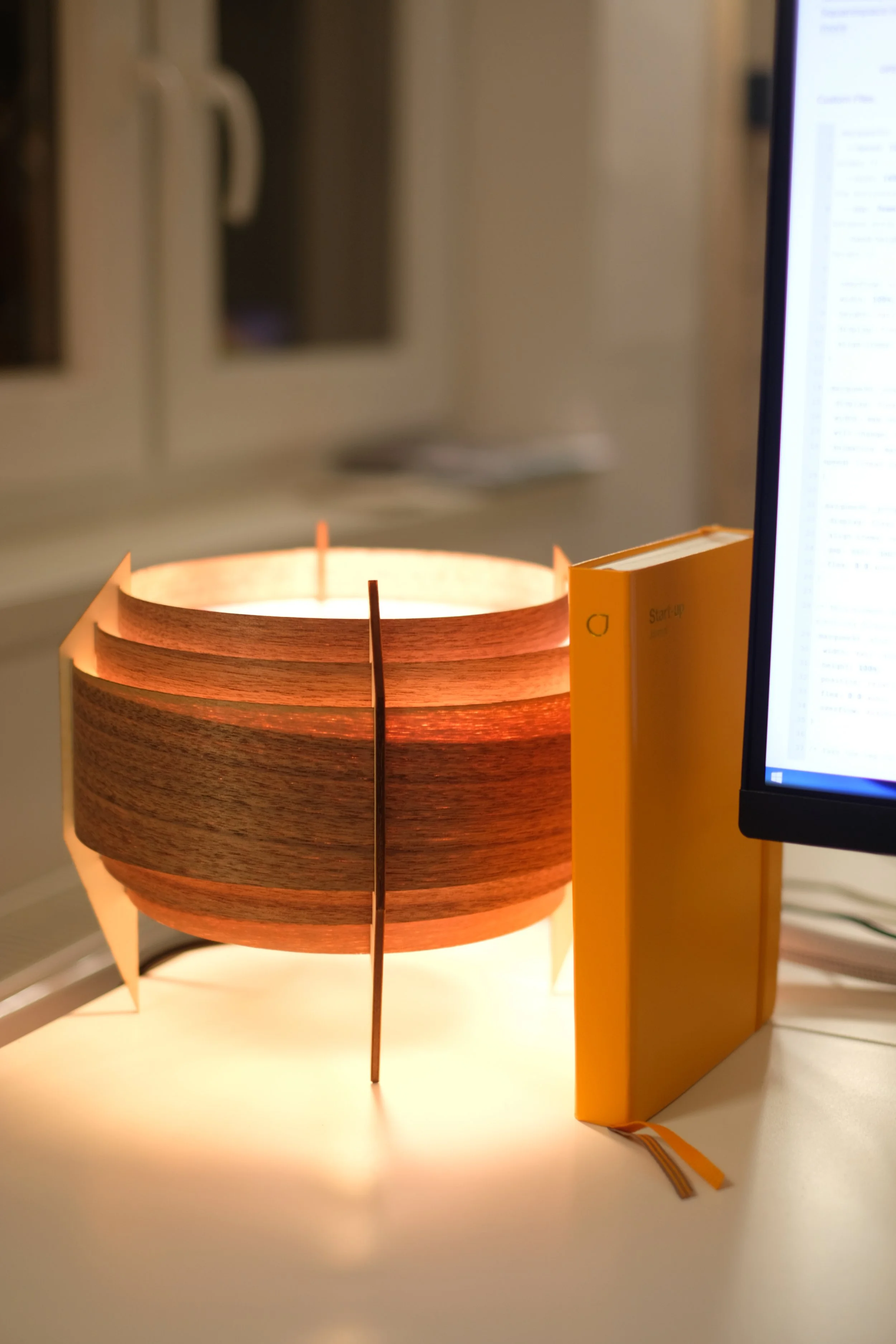 Lampstend° is a decorative table lamp made of laser-cut plywood, tinted* diffusion paper and repurposed Walnut veneer scraps.