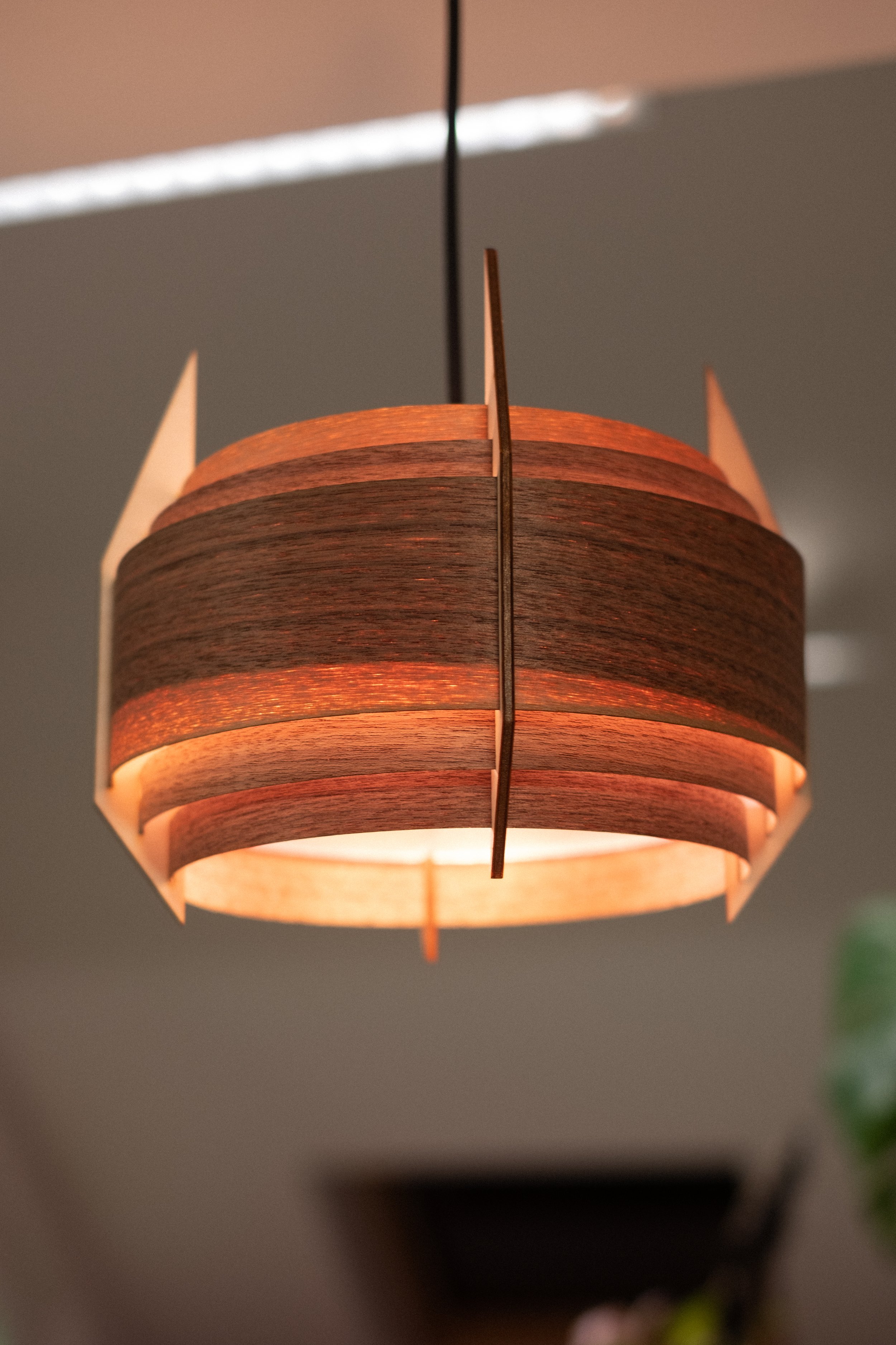 The light signature is defined by the contrast between the sharp shadows created by the veneer shade and the soft glow of the multiple coloured layers of diffusion paper. Lampstend° offers a warm, comforting atmosphere to any space it sits in.